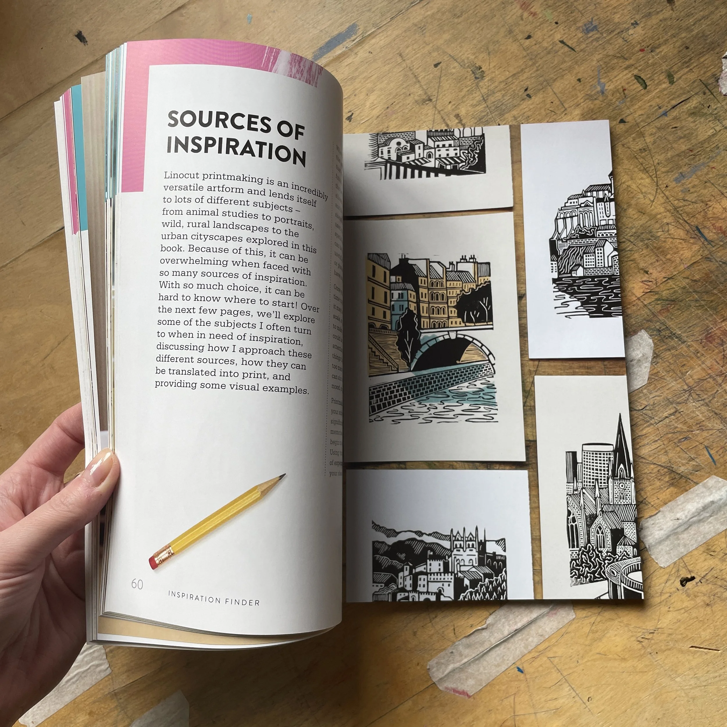 I was approached by David & Charles publishing in Spring 2024. They had seen my work on Instagram and asked if I would be interested in writing a book about printmaking, specifically making prints with the urban environment as their subject. I’ve been dreaming about writing a book since I was a kid, so of course I jumped at the chance! Within a few months we had the basic outline of the book, and now my task was to get to writing, printing, and photographing all the new projects to fill the book. We decided on five main sections: Tools and Techniques; First Projects; Inspiration Finder; Mixing Media; and Further Studies. By December 2024 the first full draft of the book was complete: 17 new projects, lots of writing, and 1000s of photos!