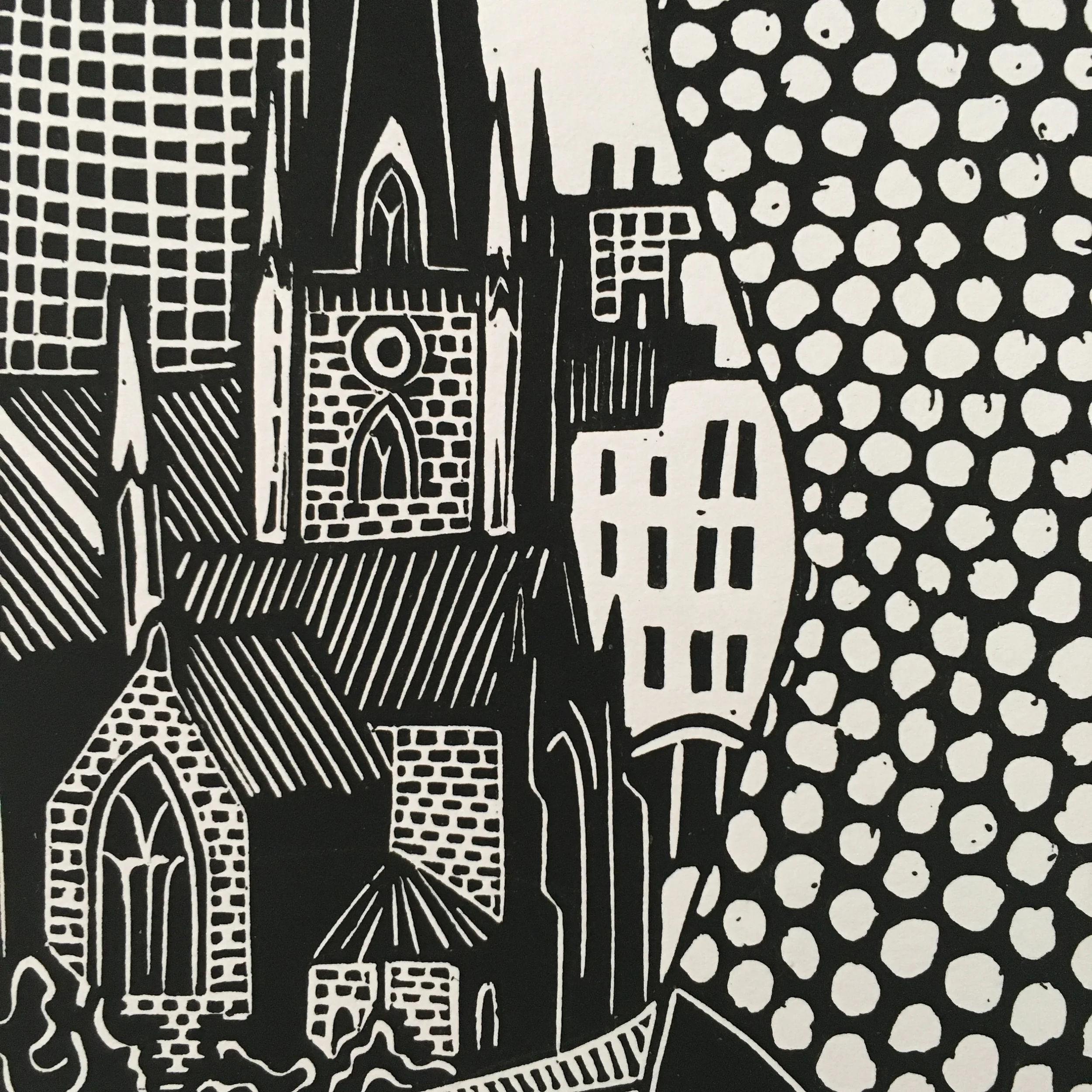 Ella Flavell is an art historian and printmaker from the West Midlands (UK). Since 2016 she has been producing linocut prints that celebrate everything from favourite films to iconic cityscapes, unique architecture to places that hold personal significance. She is particularly interested in the creation of graphic contrast, pattern, and texture, and the way that place can be both a repository for, and a medium of, memory and storytelling.