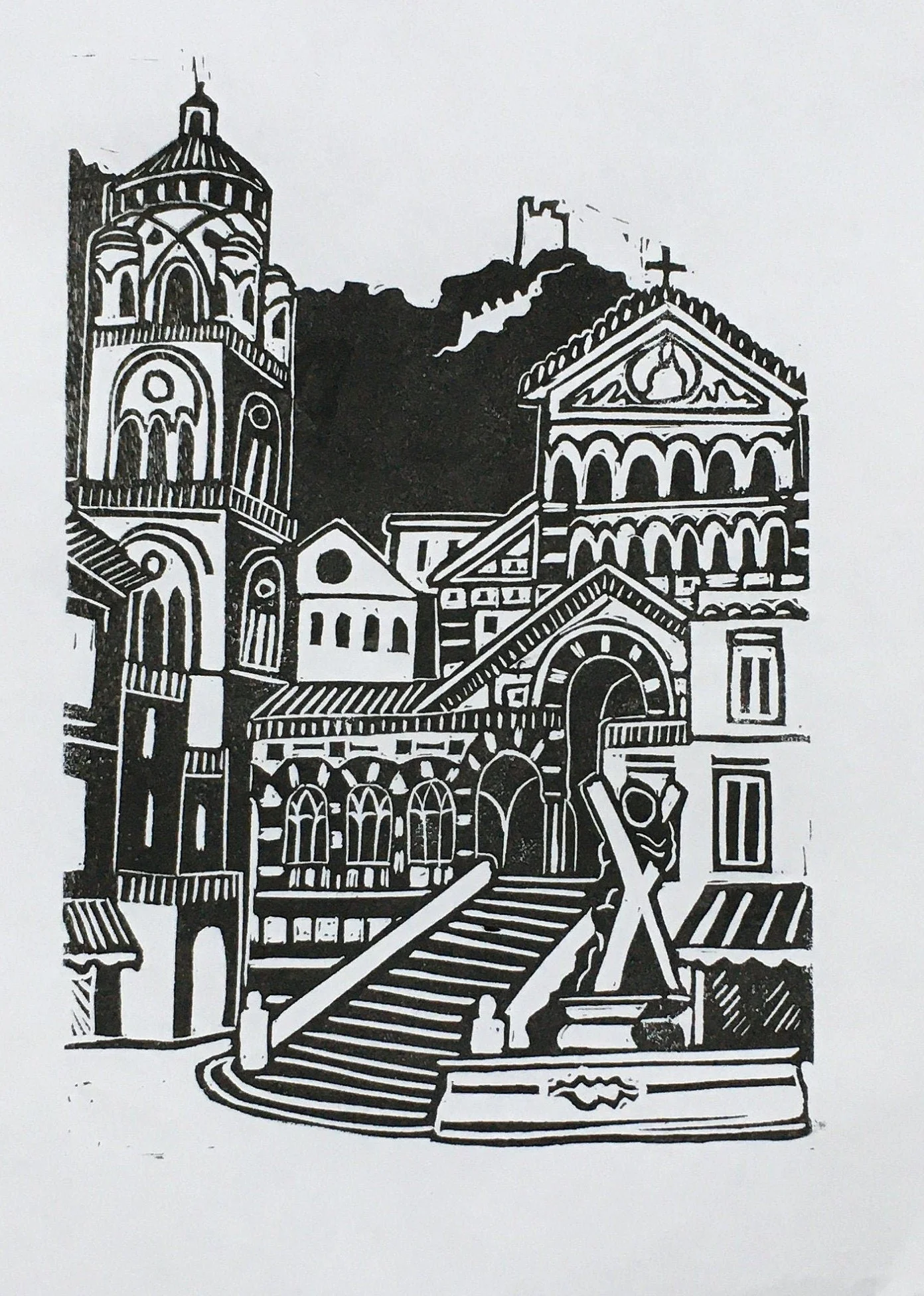 "AMALFI" Linocut by Ella Flavell Size: 21 cm x 14.8 cm (A5) Hand printed and finished. Includes the artist's signature, the work's title and the print number. Printed onto 140gsm white card.