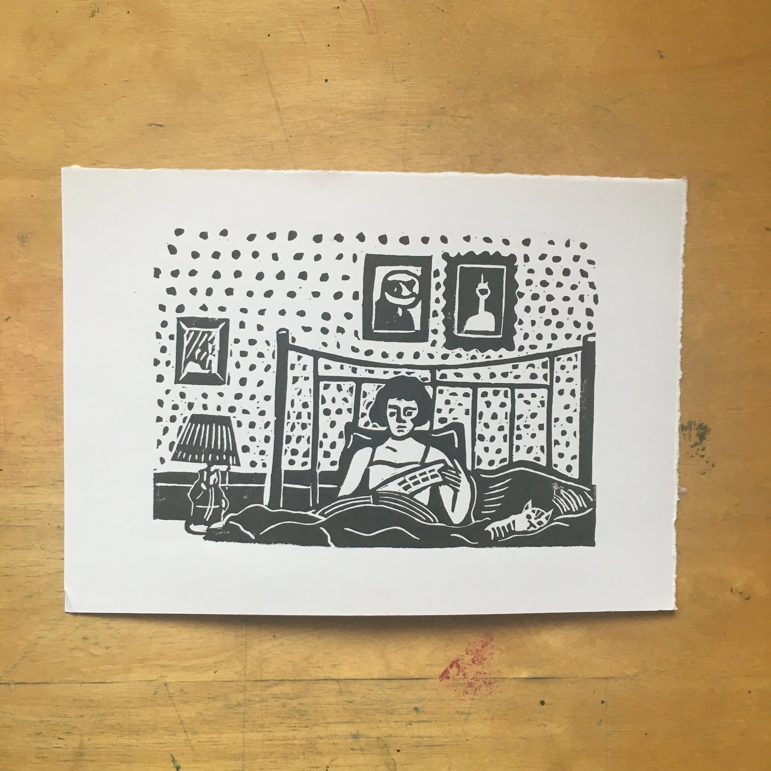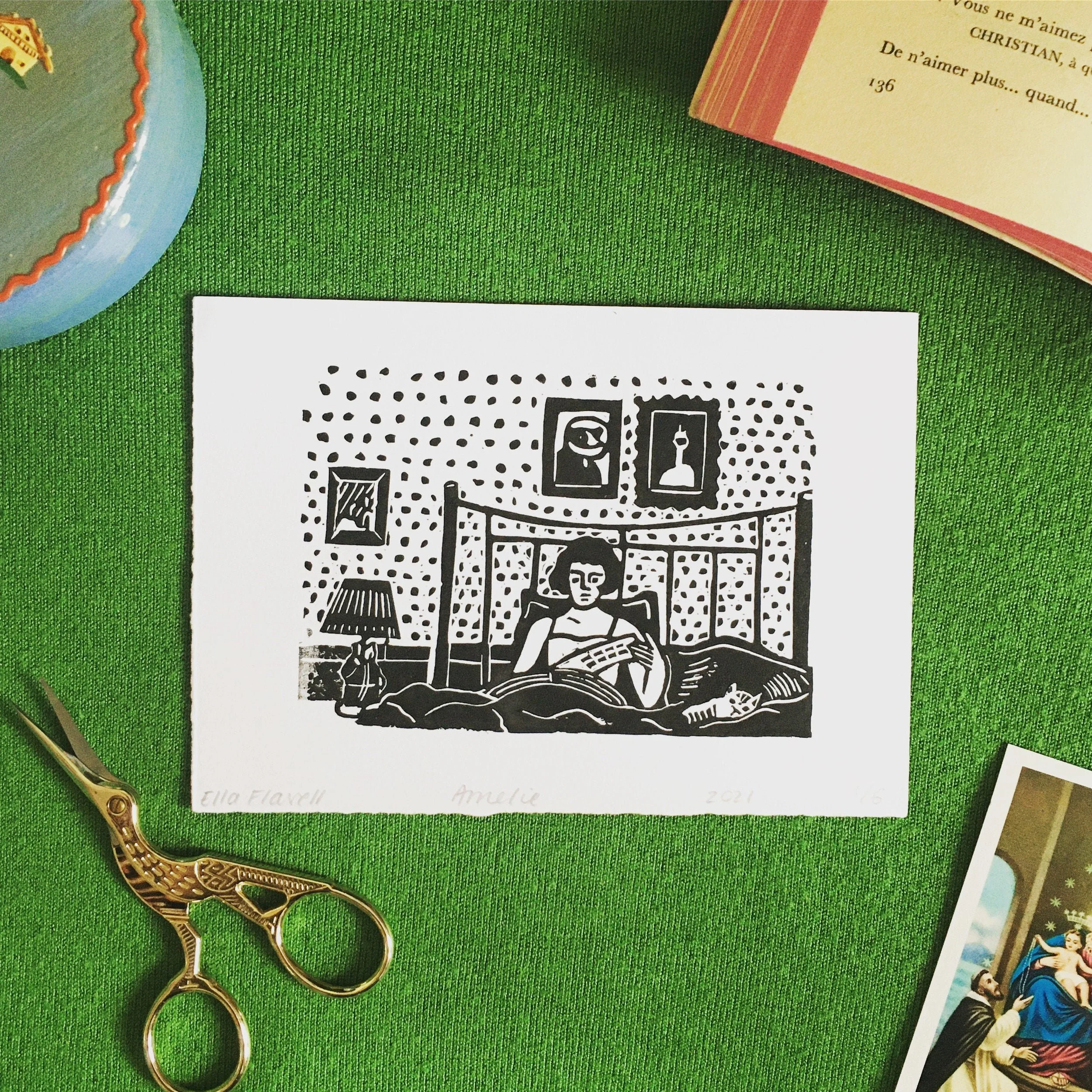 "AMELIE" Linocut by Ella Flavell Size: 10.5 cm x 14.8 (A6) Hand printed and finished. Includes the artist's signature, the work's title and the print number. Printed onto 140gsm card.