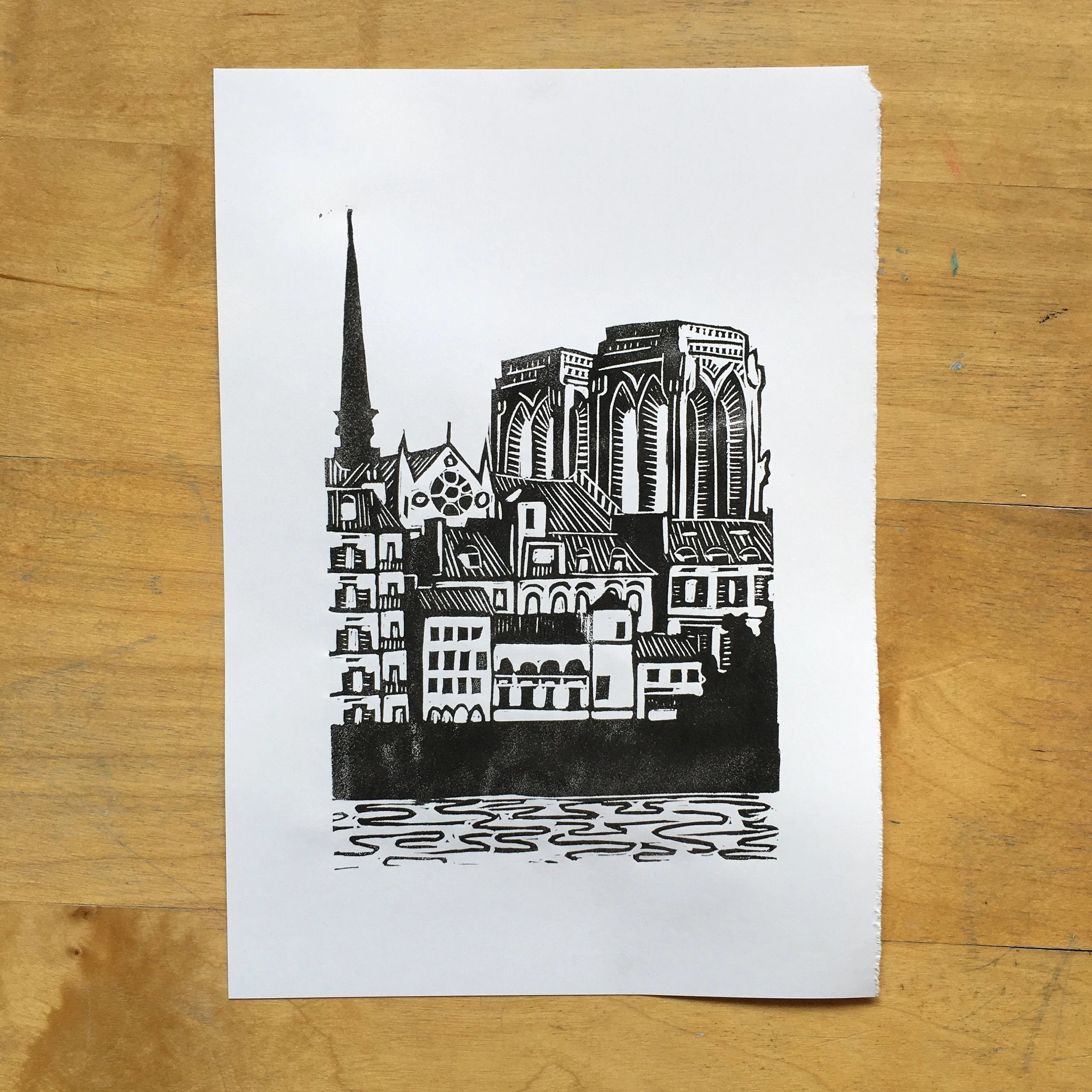 "NOTRE DAME, PARIS" Linocut by Ella Flavell Size: 21 cm x 14.8 cm (A5) Hand printed and finished. Includes the artist's signature, the work's title and the print number. Printed onto 140gsm white card.